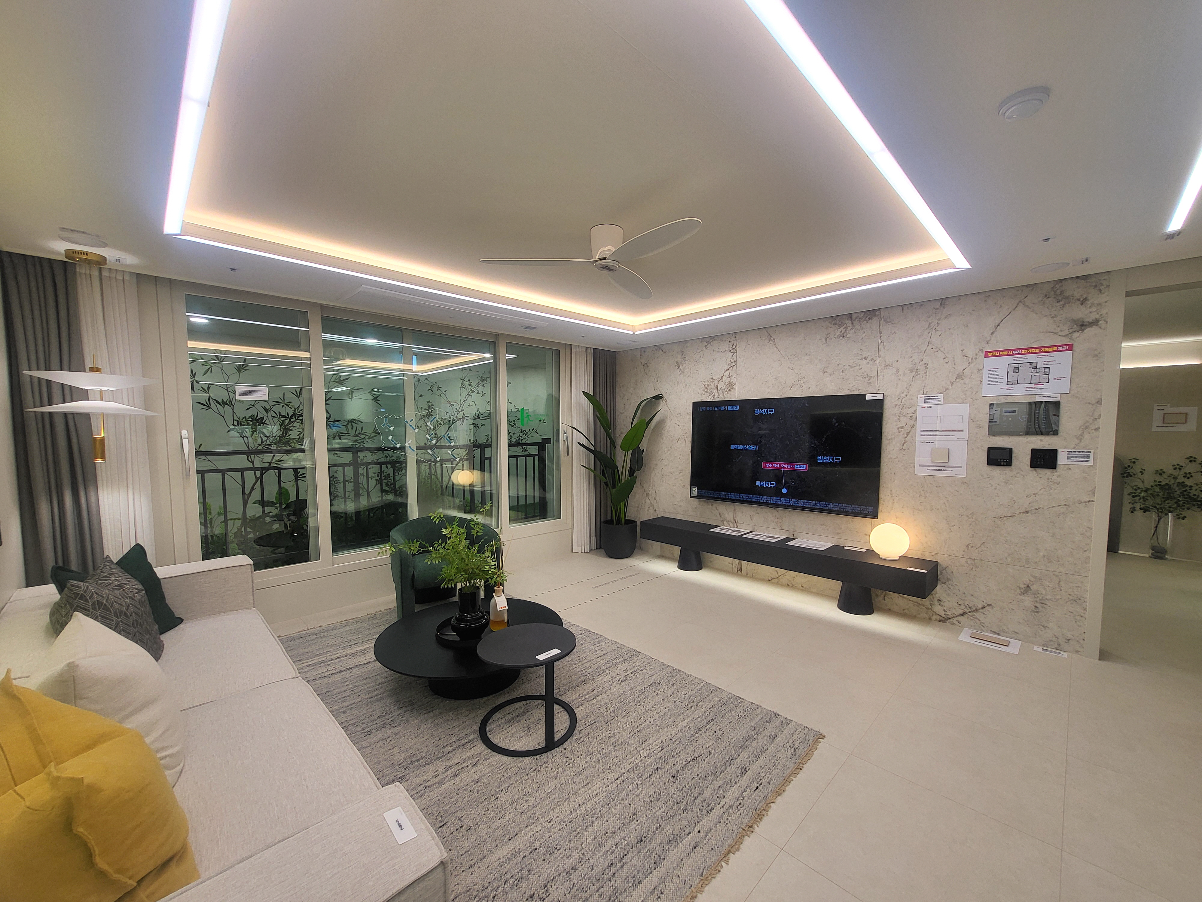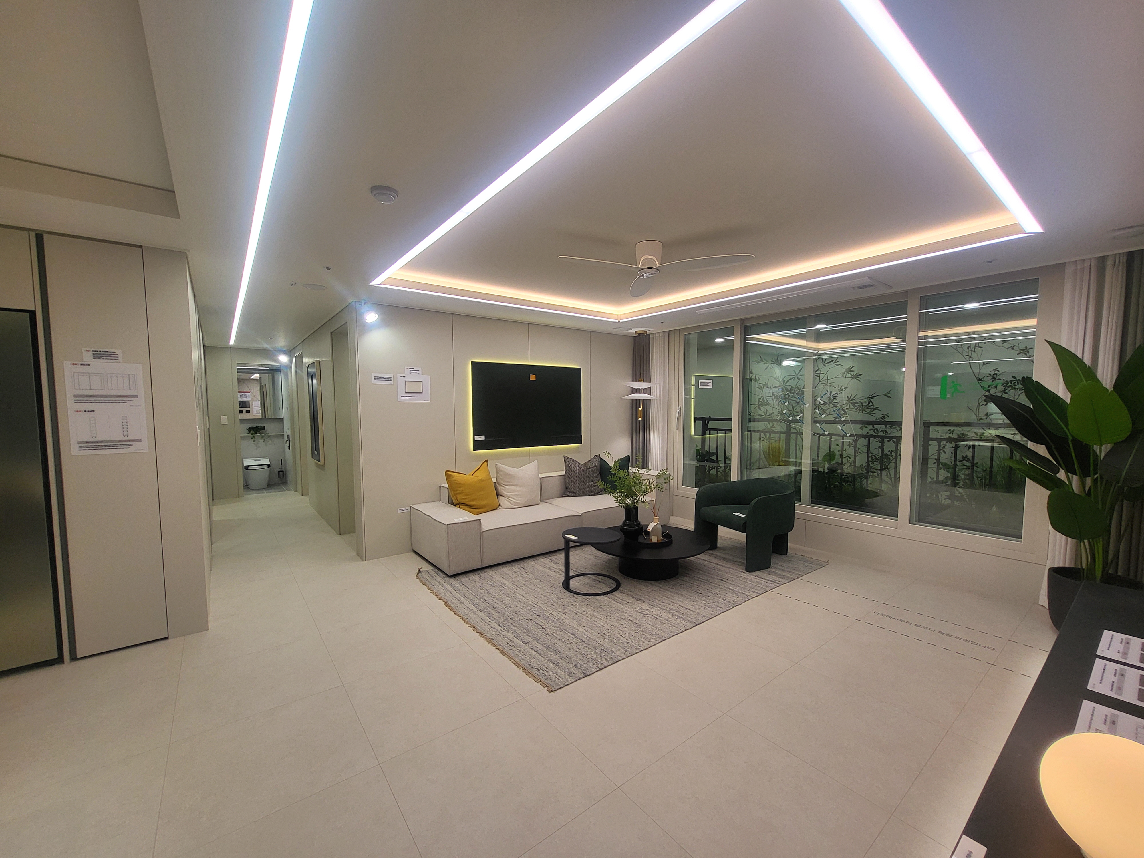 - 넓은 거실 공간: 4.48m × 3.5m로 넓은 거실 공간이 확보되어 있으며, 세라믹 타일과 아트월이 기본 제공됩니다. 조명과 스위치도 선택 가능한 유상 옵션이 있어 취향에 맞는 공간 연출이 가능합니다.
