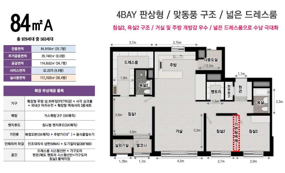 - 4Bay 판상형 + 침실3 + 욕실2 + 드레스룸 구성